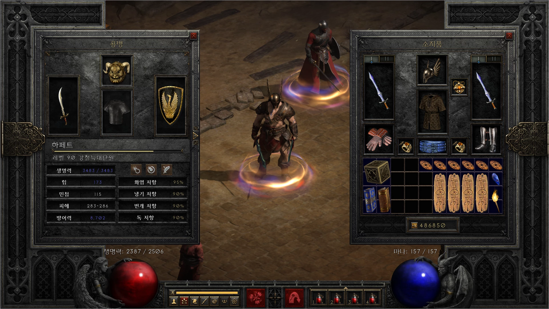 무기는 양손 모두 쌍고뇌(슬픔)입니다. 야만용사 최고의 무기입니다. 수리할 필요가 없는 페이즈 블레이드에 제작하시면 좋습니다. 콜로서스 블레이드는 공속(공격 속도) 요구치가 높아 추천하지 않습니다. 만약 형편이 안된다면 가성비 무기로 룬어 서약을 쌍으로 추천합니다. 물론 어디까지나 가성비일 뿐이지 쌍고뇌가 압도적으로 좋습니다.