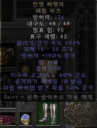 희귀(레어) 레지부츠입니다. 블리오브소서의 파멸을 든 하이엔드 세팅의 단점은 저항을 챙기기가 어렵다는 것입니다. 이렇게 저항이 고루 잘 붙은 신발을 추천합니다.